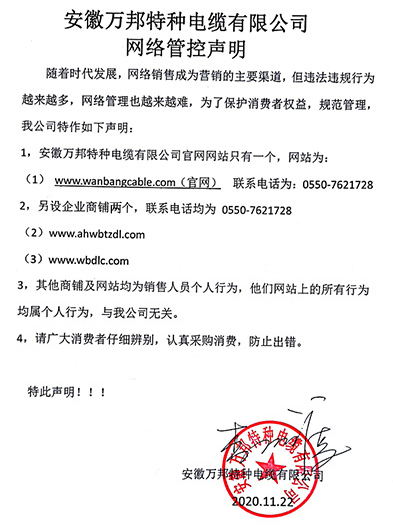 鄭重聲明:安徽萬邦特種電纜有限公司官方網站為:www_wanbangcable_com.transuner.com,除此之外無任何子網站或合作網站,其余均為假冒偽劣。電話:0550-7621728 13485756353 地 址:安徽省天長市滁州高新技術產業開發區經四路29號